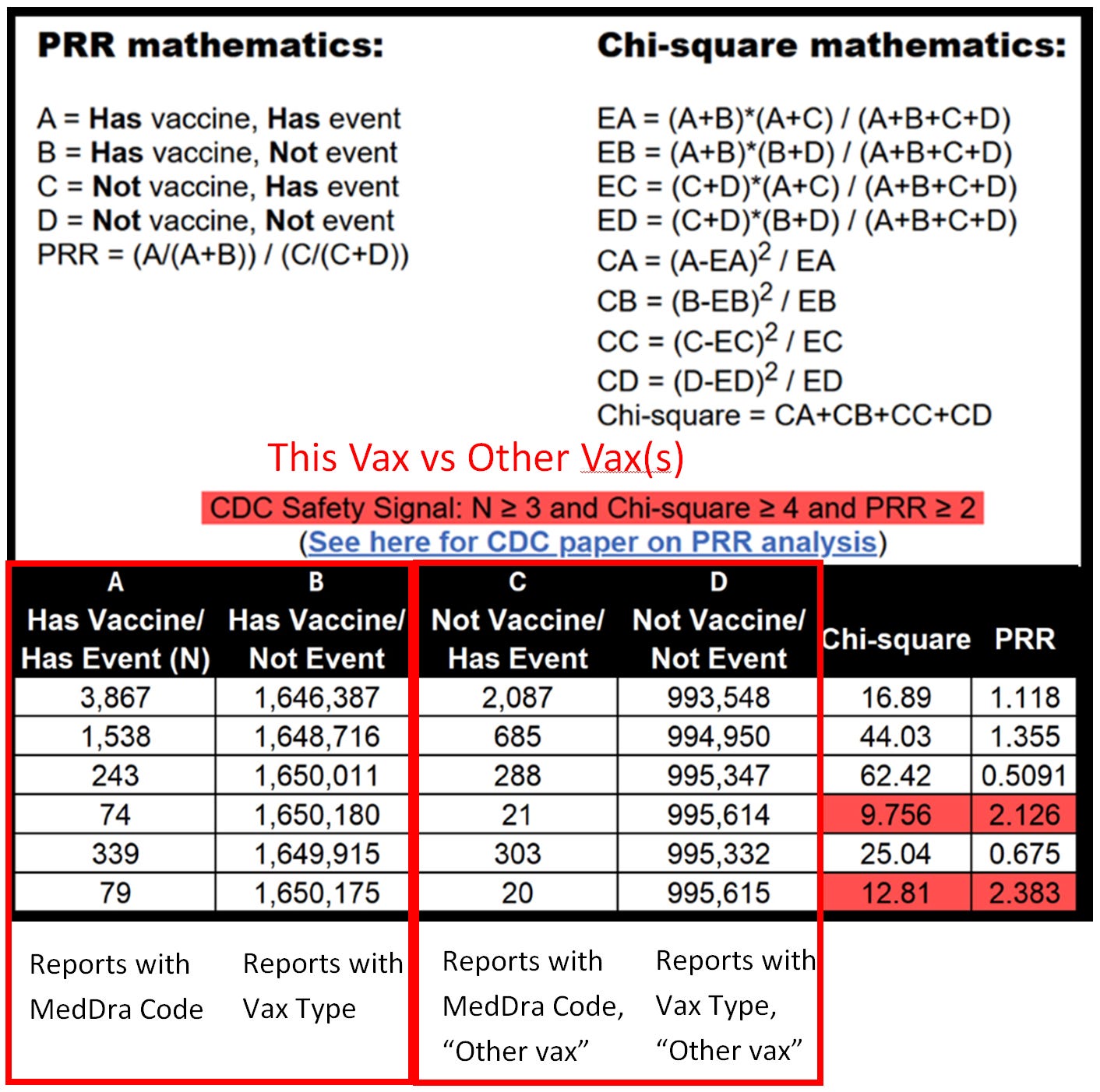 Disclaimer: Medalerts.org PRR tool is very powerful and can allow for an infinite amount of queries and combinations of analysis. Our interactive is not currently as dynamic in query options. This dashboard is simply visualizing the highest level calculations on Covid-19 jabs versus on all other vax types, minus UNKNOWN vax type. It must be recognized that any unknown vax type “co-mingled” into any unique report/case then gets included (unfortunately).