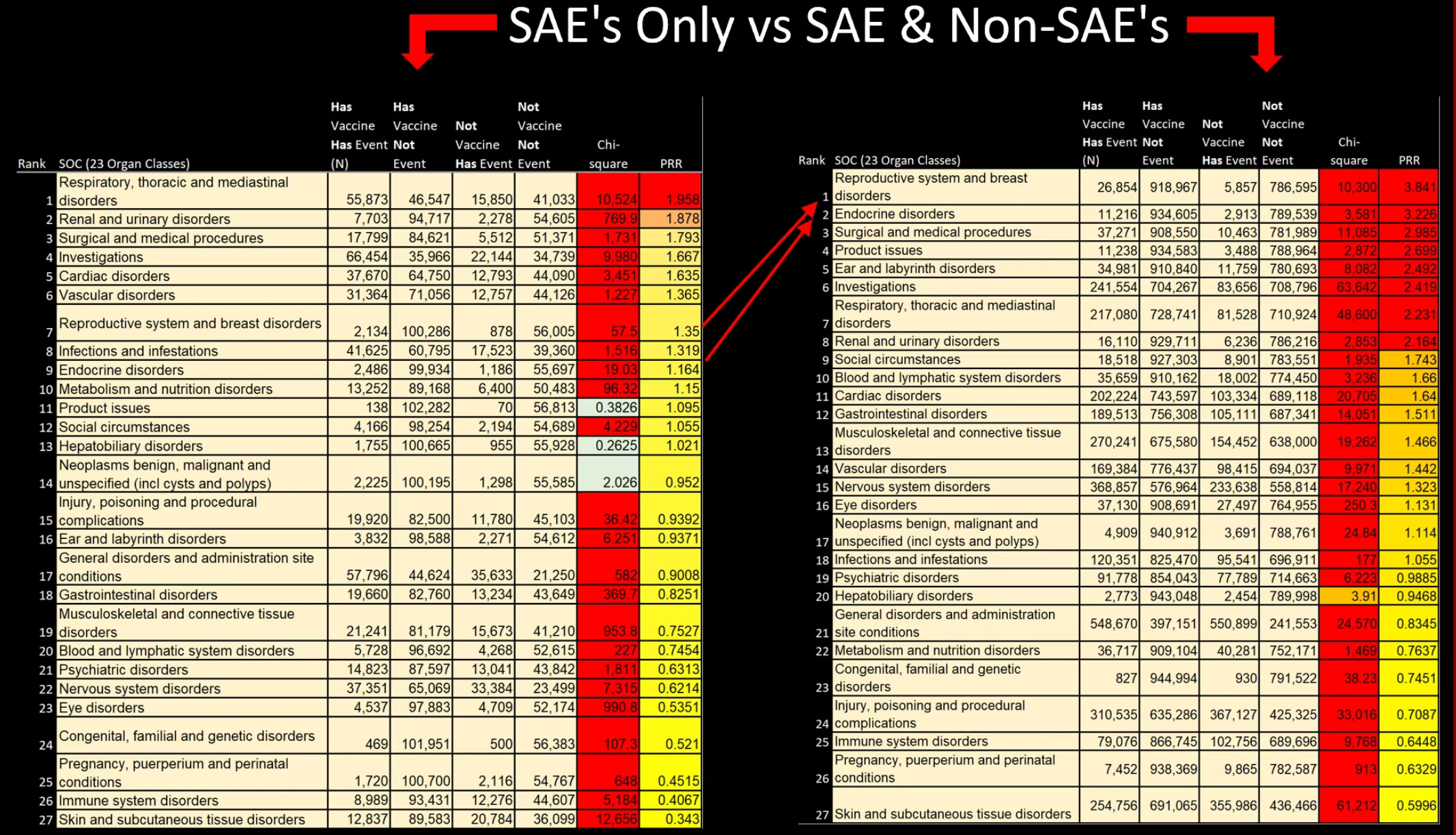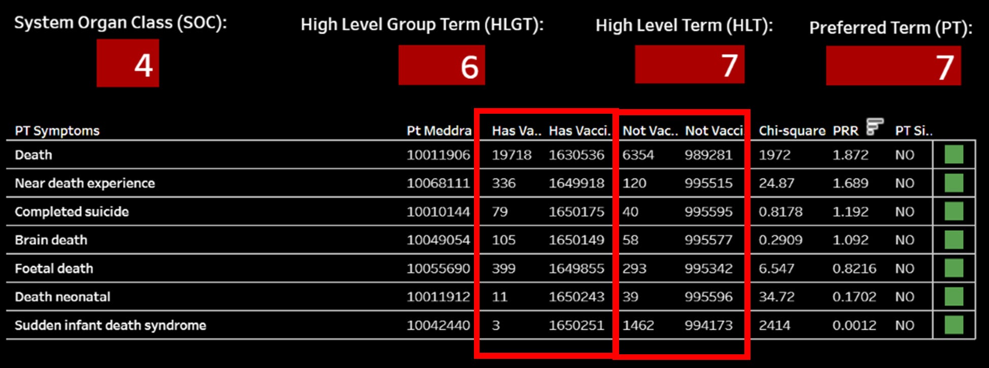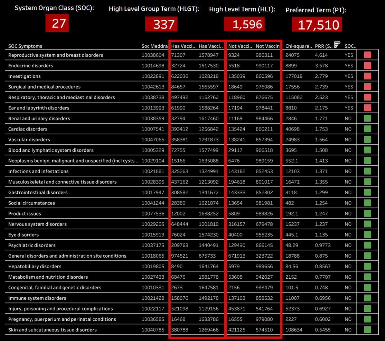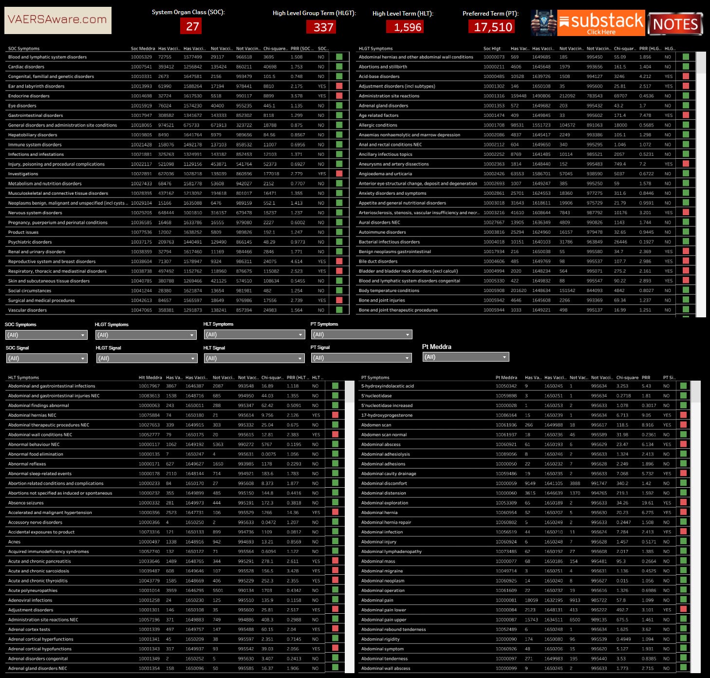 This Dashboard maps the PRR through each MedDRA level from Preferred Term (PT) to System Organ Class (SOC). The image above is the medalerts.org example of how to interpret the structured data within medalerts.org native environment and this dashboard.