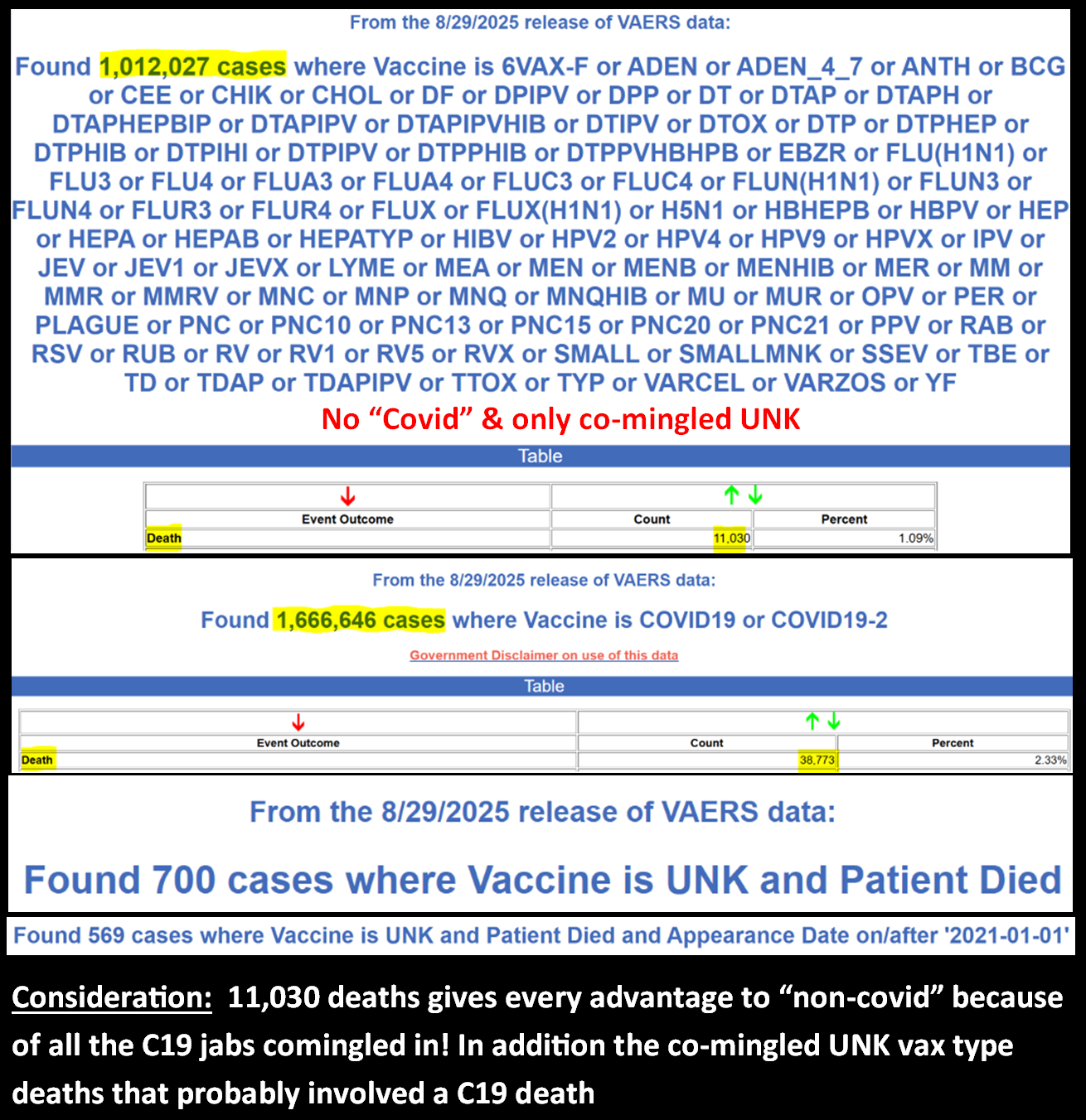 The Eagle’s note of the note, the only biases we are being subjected to here is nefarious intentions of VAERS Administrators. Not to mention the additional ~800 extra covid jab deaths in the follow-up reports that are not even being considered in these calculations. God Bless