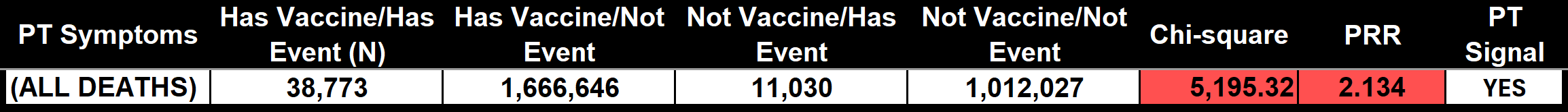 PRR = 2.147: A PRR > 2 suggests a higher proportion of death reports for COVID-19 vaccines compared to non-COVID-19 vaccines, potentially indicating a signal in pharmacovigilance (though PRR alone doesn't confirm causation).