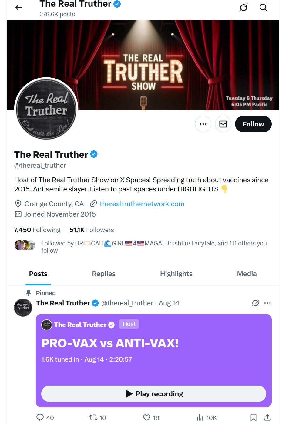 This is a echo chamber of pro vaxxers led by the “Real Truther” his real name in Noah R. but he gets bent about his anonymity and expects everybody to honor his anonymity even though he’s very public on linkedin and Vimeo and other places as himself. He is like the smartest HS diploma guy but he is married to MD so I guess that makes him an expert. Anyways he knows better than to fuck with me primarily because I’m me. I used to love and just sit and listen to these clowns in their “Spaces” and I don’t request a mic unless they prod me to go up and speak which I’ve done a couple times. I’ve been nice and cordial those couple times but for some reason I’m now blocked from listening to their live spaces for about ~3 months. Anyways I used to razz them pretty good in the comments section. I’ve noticed for some strange reason their community is filled with homosexuals and more than normal, so I’ve used this factoid for my own guilty pleasure and fun razzing this particular community.